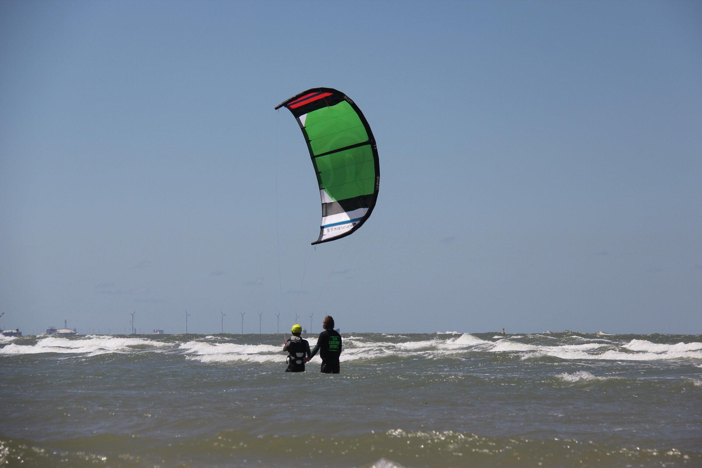 My son (12 yo) and I each took separate kitesurfing lessons at Sport Cadzand. They have great instructors! These guys are not just there to earn some quick cash. They are avid kiteboarders themselves with a great love for the sport. Their experience shows when they're teaching: no cowboy stuff, good guidance and exercise on safety and rescue maneuvers and very good attention to what the student is doing so that you're up-and-ripping in no time. The school is located at the North Sea in Cadzand. The beach at this spot is very large, so you have plenty of room to prep your gear and practice your first maneuvers with a powerkite. The sea is cold though and the tides are strong, so watch out if you're not used to that.